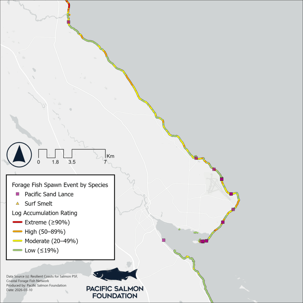 Figure 5. Log accumulation in the northern half of the Comox Valley Regional District, overlaid with monitoring efforts by the Coastal Forage Fish Network.
