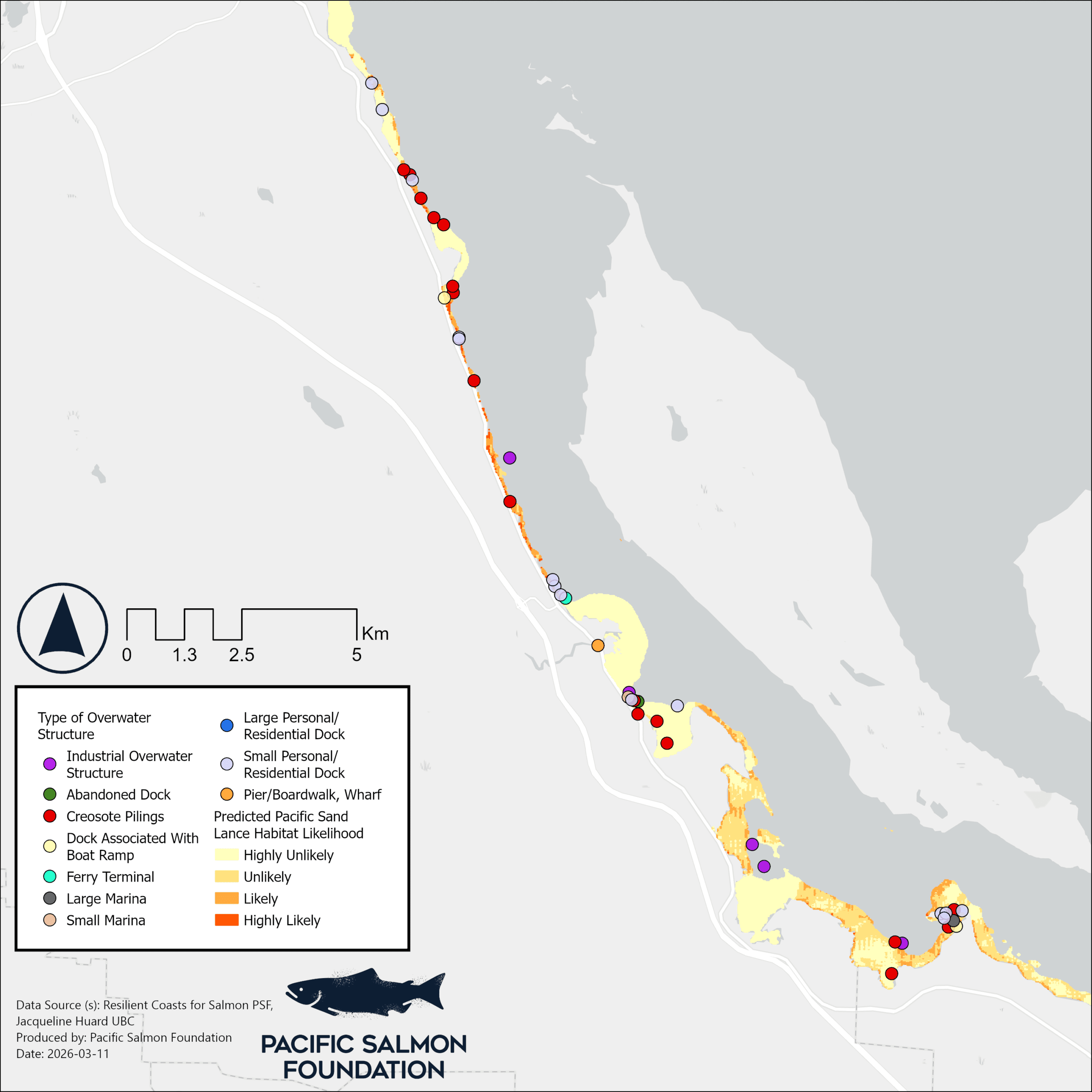 Figure 4. The extent of overwater structures within the southern half of Comox Valley Regional District, overlaid with a model of predicted Pacific sand lance spawning habitat (Huard 2022).