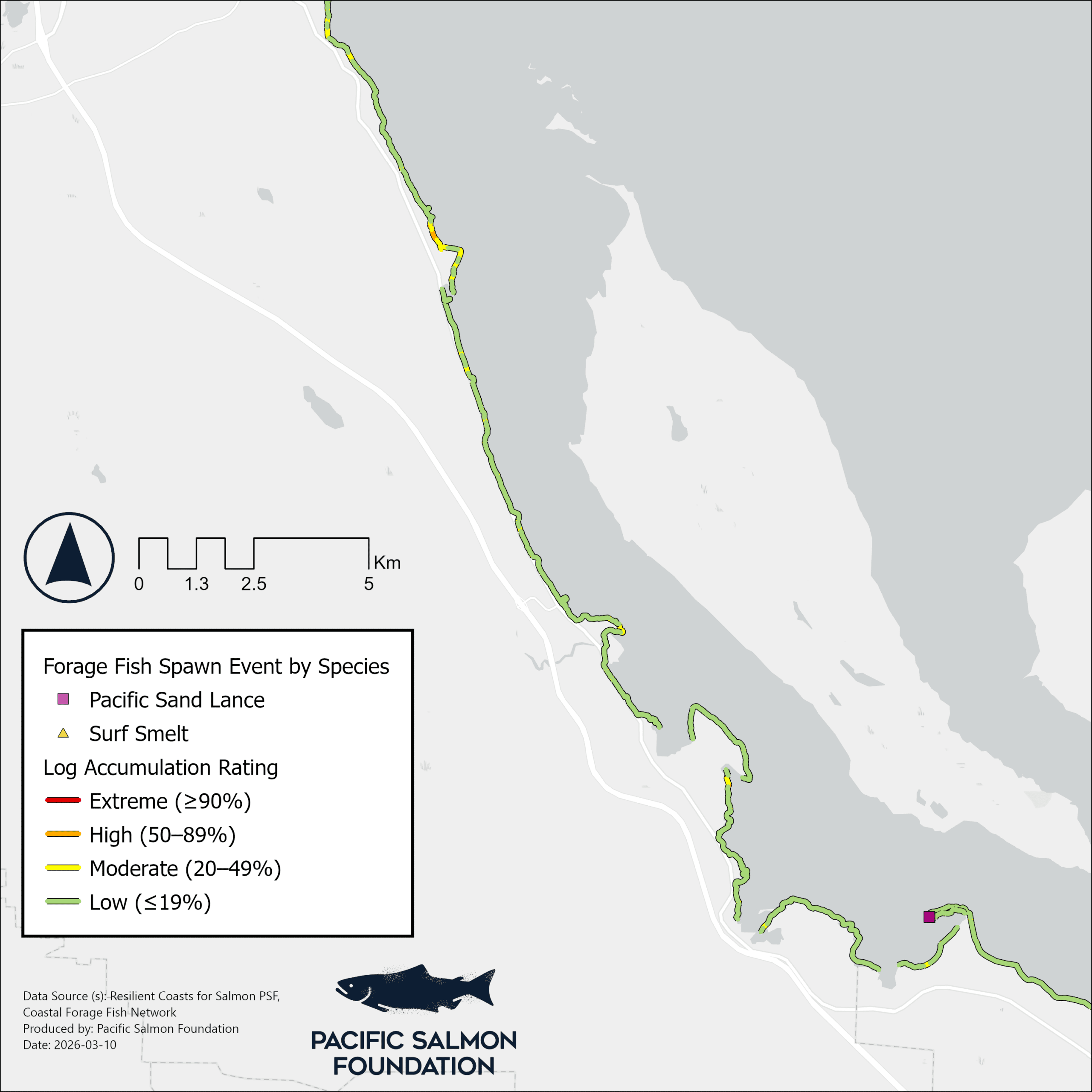 Figure 5. Log accumulation in the northern half of the Comox Valley Regional District, overlaid with monitoring efforts by the Coastal Forage Fish Network.