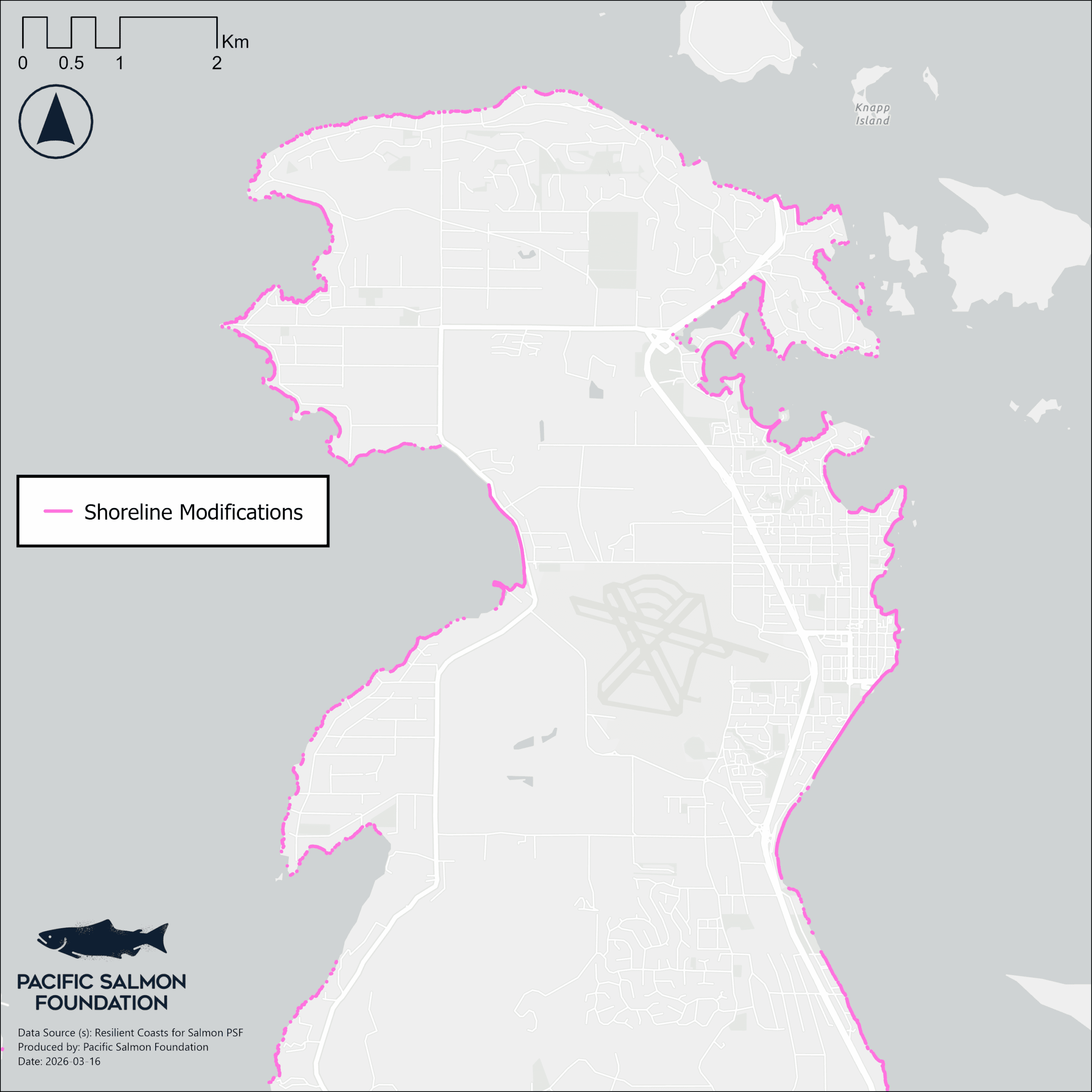The Resilient Coasts for Salmon team developed protocols, collected and digitized data on coastal modifications for much of the east coast of Vancouver Island. This was prompted by community groups and researchers expressing the need for facilitating informed decision-making for adapting to coastal climate change with nature in mind, to highlight vulnerable areas to explore further with coastal geomorphologists and encourage communities to opt for precautionary approaches to shoreline management that can continue to support communities and natural systems. Digitization protocols were developed for 1. modifications present on the shoreline (hard armouring like seawalls), 2. overwater structures and pilings (e.g., docks), and 3. log accumulation, yielding three corresponding datasets.