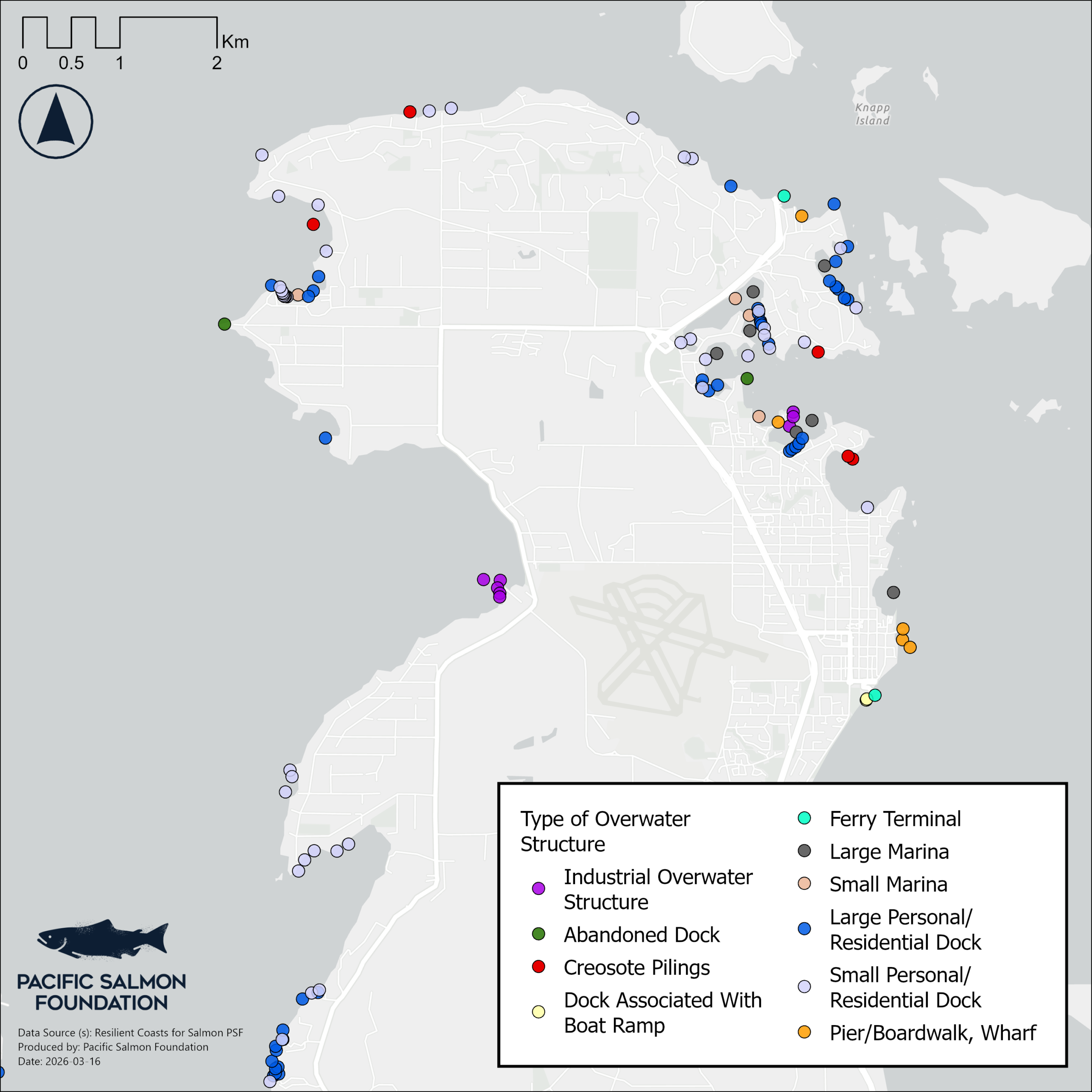 The raw Resilient Coasts for Salmon data (i.e. coastal modification features, overwater structures and log accumulation) are available for download for this community, and others, as well as the entire east coast of Vancouver island. Visit the Resilient Coasts for Salmon page within the Marine Data Portal.