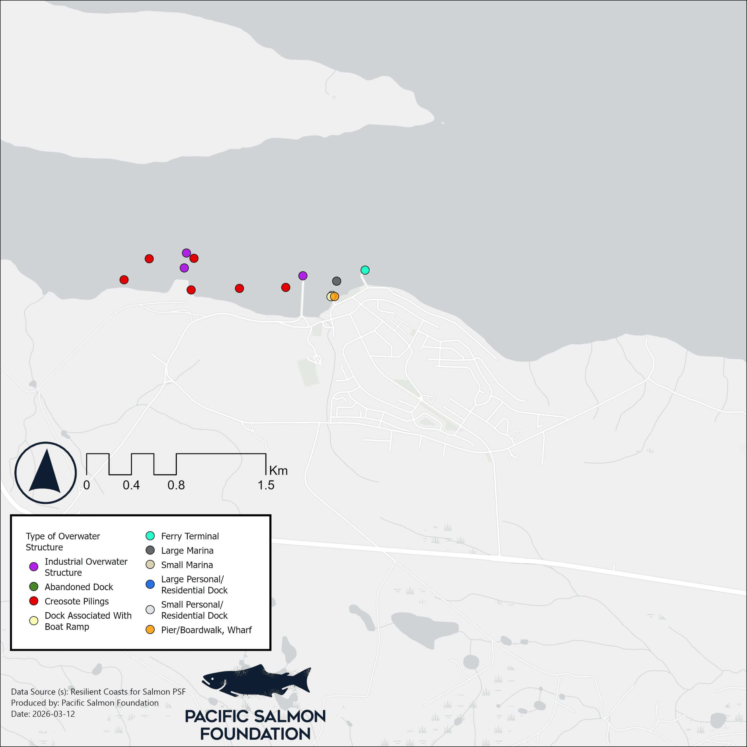 The raw Resilient Coasts for Salmon data (i.e. coastal modification features, overwater structures and log accumulation) are available for download for this community, and others, as well as the entire east coast of Vancouver island. Visit the Resilient Coasts for Salmon page within the Marine Data Portal.